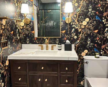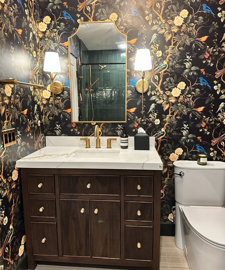 Transforming the space into a sanctuary, the bathroom now boasts bold moody wallpaper that envelops you in a comforting embrace. The use of organic materials, with rich walnut and sleek marble, creates a seamless blend of nature and luxury. Deep green zelige tiles, reminiscent of lush forest hues, adorn the walls, while the elegant brass hardware adds a touch of sophistication and warmth, making this rejuvenated space a true oasis.